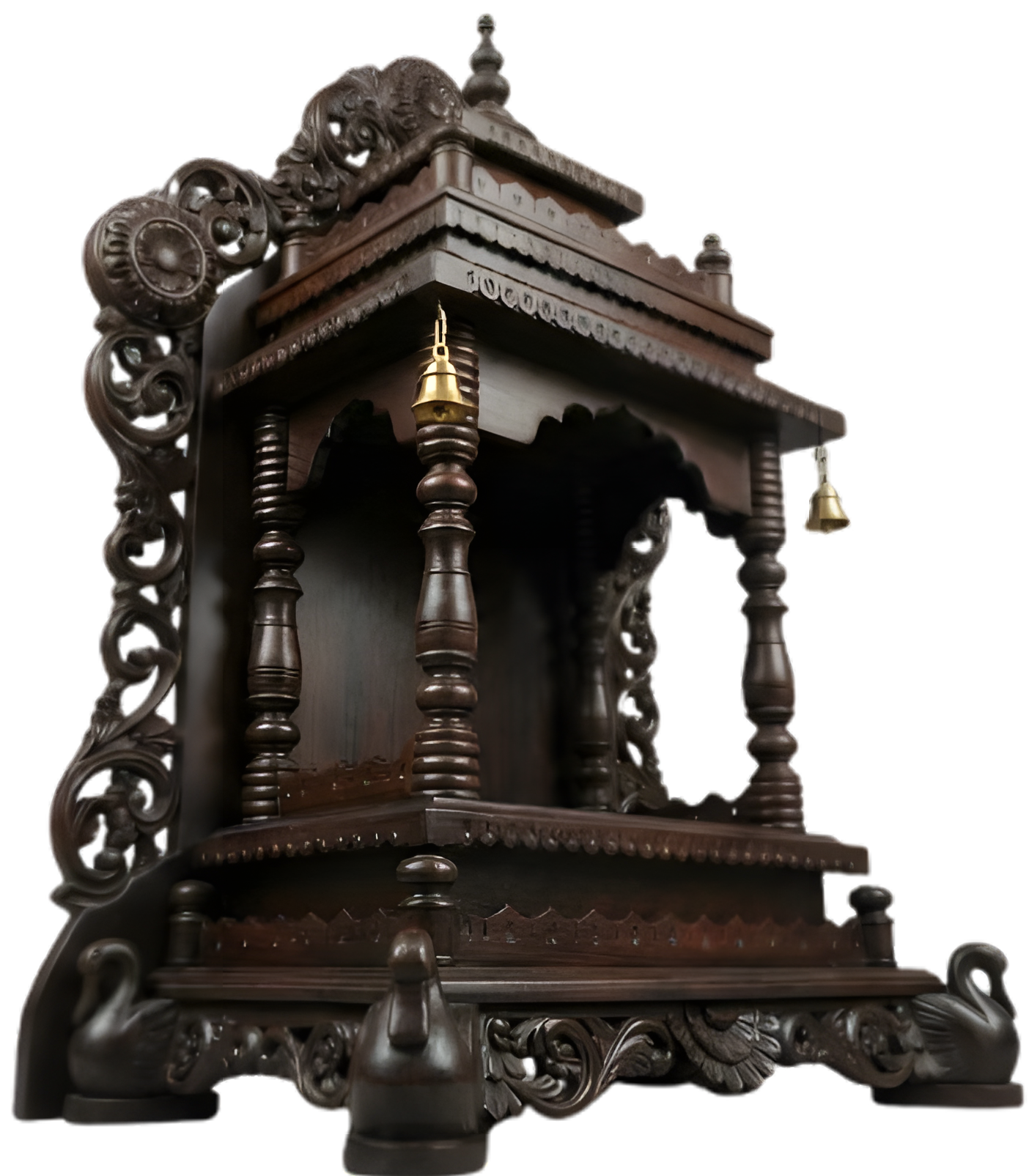 A Vimāna mandir is not merely an object; it is a dedicated space for the divine. Hewn from single slabs of aged Rosewood and Teak, each piece carries the weight of permanence.